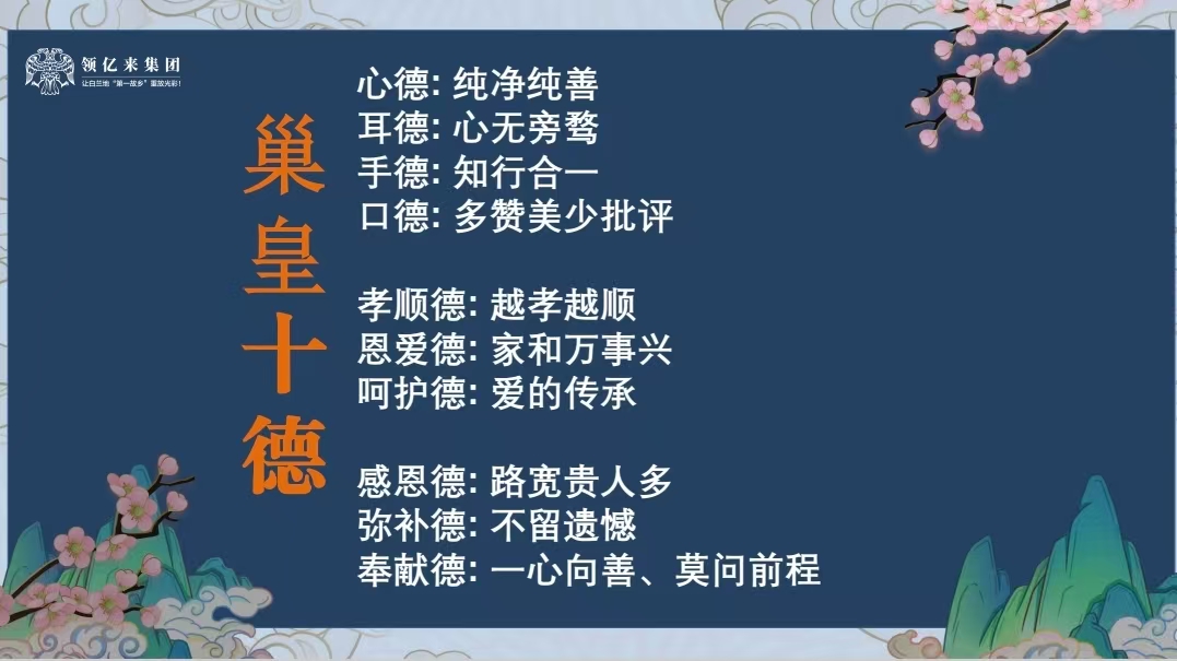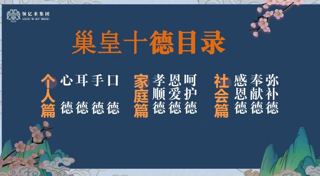 “巢皇十德”由领亿来集团首任董事长许恩诚与开仓放良品牌创始人欧富相作为发起人联合创立,深度融合巢皇大帝有巢氏“构木为巢”的文明智慧与儒家伦理精髓,系统构建起涵盖个人心境、家庭伦理、社会担当的德行实践体系。其十项核心德目——心德(忠)、耳德(智)、手德(信)、口德(礼)、孝顺德(孝)、恩爱德(勇)、呵护德(廉)、感恩德(仁)、弥补德(耻)、奉献德(义),既是对中华文明“修身齐家治国平天下”理念的创造性转化,更为当代社会提供了可落地的道德实践范式。这一文化体系已获学界高度评价,被认为是“传统伦理的现代性突破”。