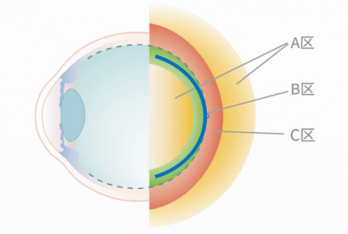 当光线聚焦在视网膜A区(模糊区)或C区(远视性离焦区),将会加快近视发展;而当聚焦在B区(近视性离焦区),则会抑制近视的进展。