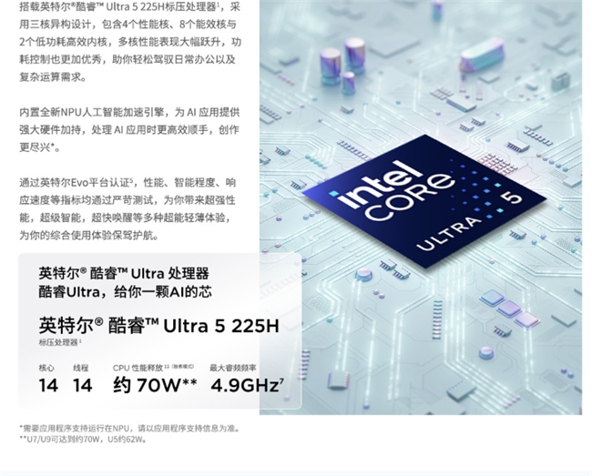 ThinkBook 14+ 2025 AI全能本搭载了英特尔酷睿™Ultra 5 225H标压处理器,并通过了严苛的英特尔Evo平台认证。这意味着它具备了超能电力、超快唤醒、超强性能等特质。其核心14线程的配置,在约70W的强劲性能释放下,无论是处理复杂的多任务办公、运行专业软件,还是进行初步的AI计算和内容创作,都能做到游刃有余,流畅自如。