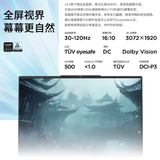它配备了一块14.5英寸的微边距全面屏,屏占比高达90%,几乎消除了边框的束缚,带来了极为沉浸的视觉体验。3K的高分辨率配合120Hz的高刷新率,画面细腻且顺滑。更值得一提的是,它通过了TÜV硬件低蓝光认证和TÜV Eyesafe护眼认证,能有效减少有害蓝光辐射,即使长时间紧盯屏幕处理工作,眼睛也不易感到疲劳,关爱每一位职场人的健康。