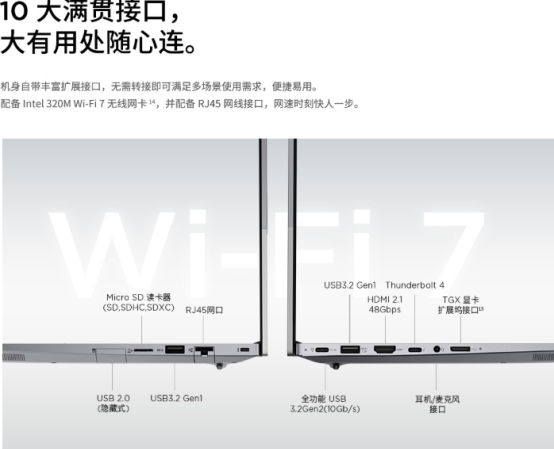 机身虽轻薄,但扩展性却毫不妥协。ThinkBook 14+ 2025 AI全能本配备了多达十大全能接口,涵盖了日常办公所需的各种连接方式。无论是外接显示器、投影仪,还是读取各类存储设备,出门都无需再携带笨重的拓展坞,极大地提升了移动办公的便捷性与专业性。