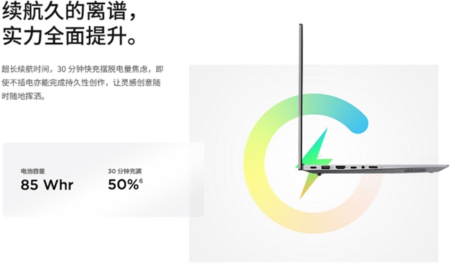 对于经常需要移动办公的职场人士而言,续航是至关重要的考量。该笔记本内置85Whr大容量电池,能够提供持久的续航支持。同时,它支持快速充电技术,仅需30分钟即可将电量充至50%,有效解决了“电量焦虑症”,让工作不断链。