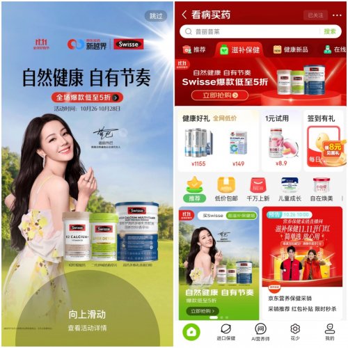 依托京东IP的强劲动销势能,Swisse斯维诗在站外积极开展内容种草的同时,于京东站内同步上线“健康新越界”专属品牌会场,围绕王牌产品,构建“内容种草—流量引流—站内转化”的高效闭环,为11.11营销全面蓄势。