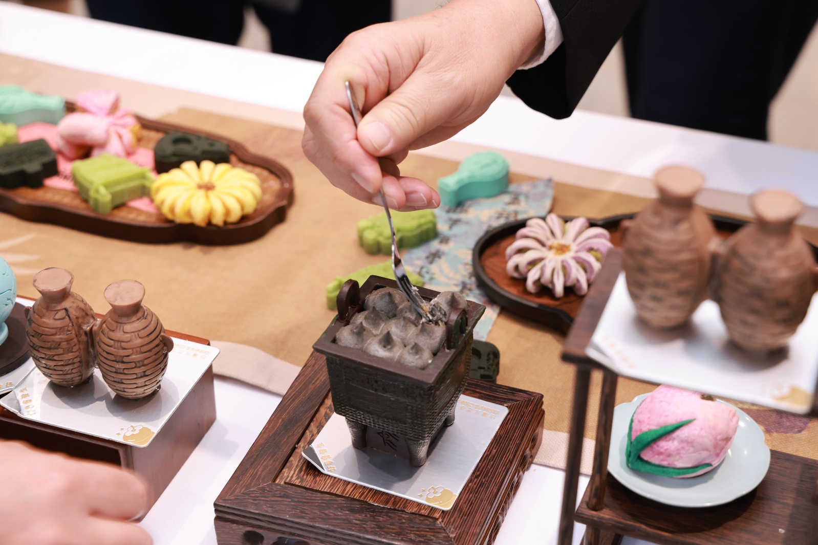 这些甜品不仅追求形似,更在口味上深挖“河南元素”。例如,一款以“杜岭方鼎”为外形的甜品以河南驻马店黑芝麻为主味食材,而“兽面青铜钺”造型甜品其夹心则融入了河南小麦的谷物香,既承载“商汤王都”的历史记忆,又饱含中原大地的风土情怀,实现了从视觉到味觉的文化沉浸。这种“器物形制+文化内涵+地域食材”的创作逻辑,让文物从展柜走向日常,成为可感知的在地文化载体。