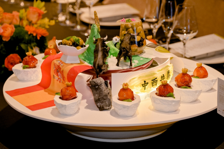 文化菜品环节尤为亮眼,主厨通过华夏一京(橄榄风味明虾球)、中西同心(水晶橄榄古老肉)、福禄同攸(鲍参橄榄皆是福)、香山万秋(橄榄板栗雪花牛)与御梨霜秋(橄榄芝士焗蟹斗)五道大菜,将西班牙橄榄巧妙融入经典中餐架构并与餐饮文化结合,展现出浓郁东方意蕴与地中海风情的和谐共鸣。