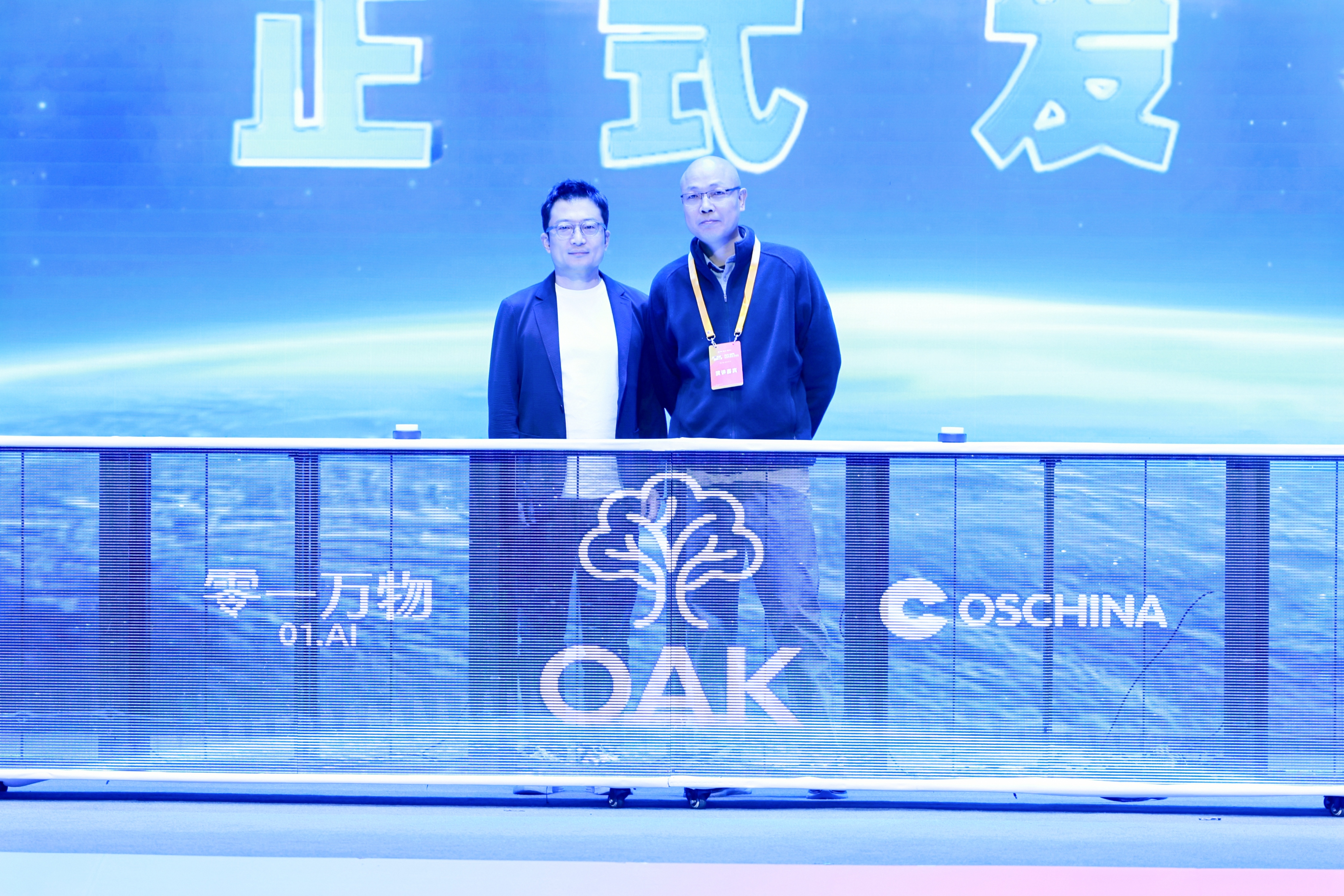 零一万物联合创始人 马杰(左),开源中国创始人、CTO 刘冬(右)联合发布OAK平台