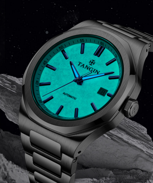 尊达认为,传统腕表的夜光设计仅局限于指针与时标,未能突破“点缀”的局限。而“星陨八芒”的核心突破,在于将整块表盘转化为发光体——这一技术为制表行业首次实现。尊达摒弃了皇家橡树的“Tapisserie”格纹,与Studio Divine合作,开发出“微锻酸蚀叠层技术”,将钛金属与钯合金叠加压制,通过控制冷却速度形成非晶态金属玻璃基材;
