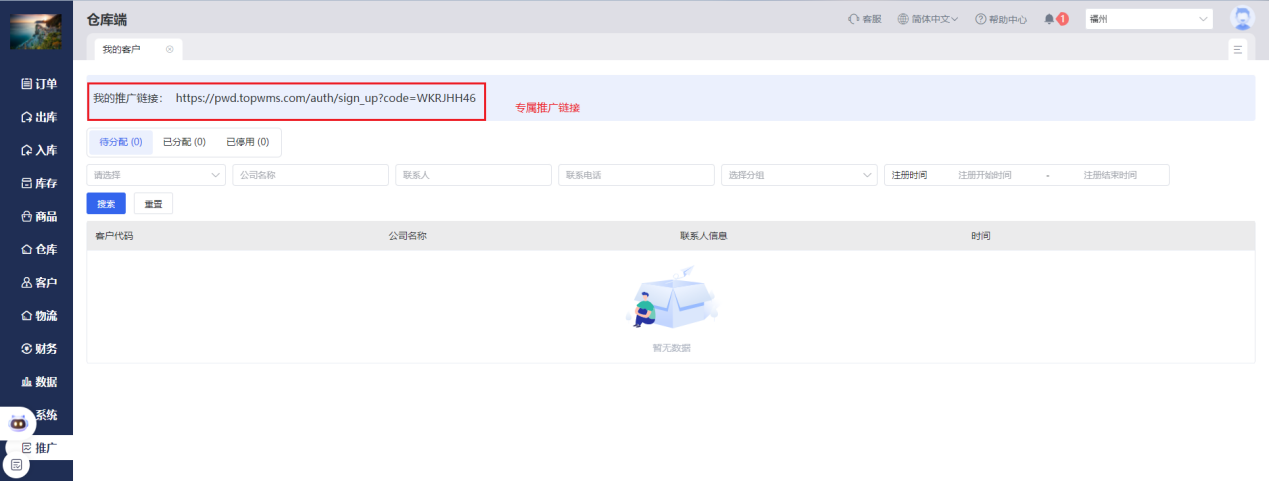 随着跨境电商的发展,越来越多的卖家选择在外建立海外仓,所以现在海外仓的竞争也是越来越大,很多的海外仓老板们都在烦恼一个问题,那就是海外仓客户怎么找?自己去寻找客户很难,我们之前仓库也是在苦恼这个问题,客户越来越少,后面经过业内朋友推荐,使用了TOPWMS海外仓管理系统,里面有一个客户拓展功能:线上合作推广功能,简单来说就是你给推广者点佣金福利,推广者帮忙你推广你的海外仓。