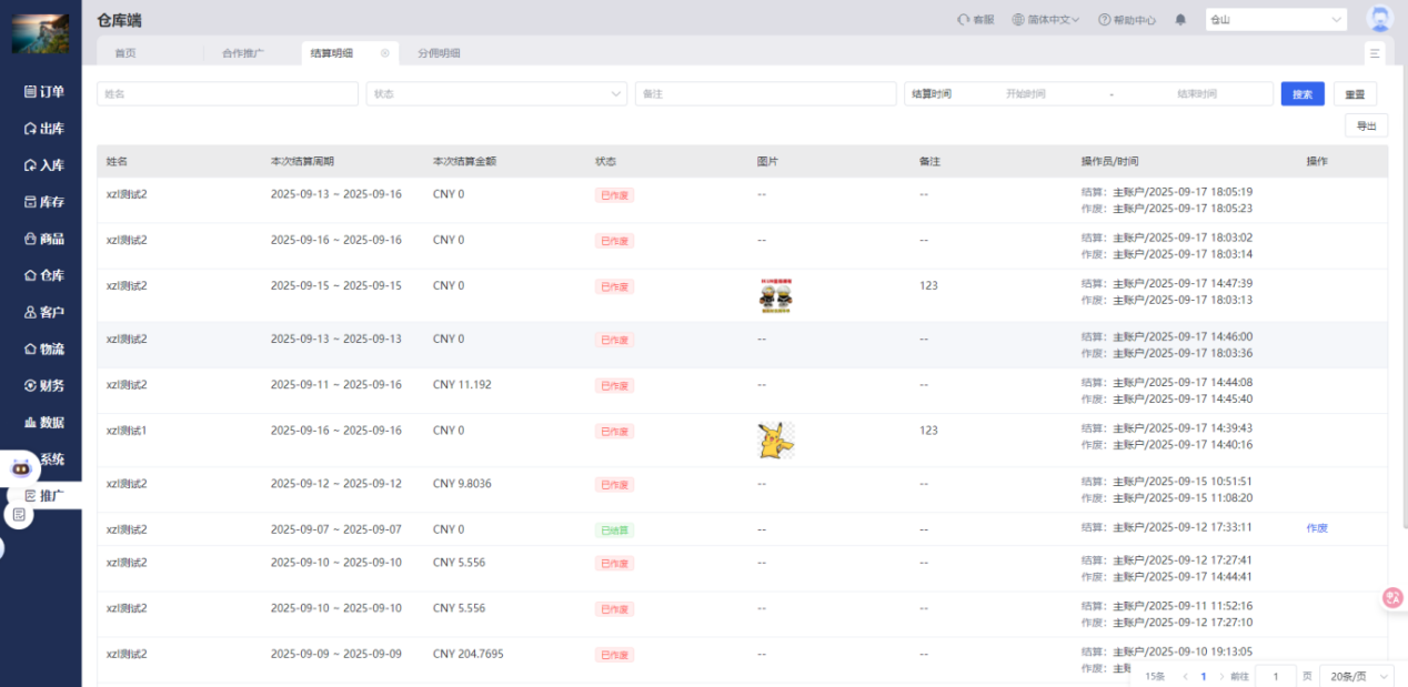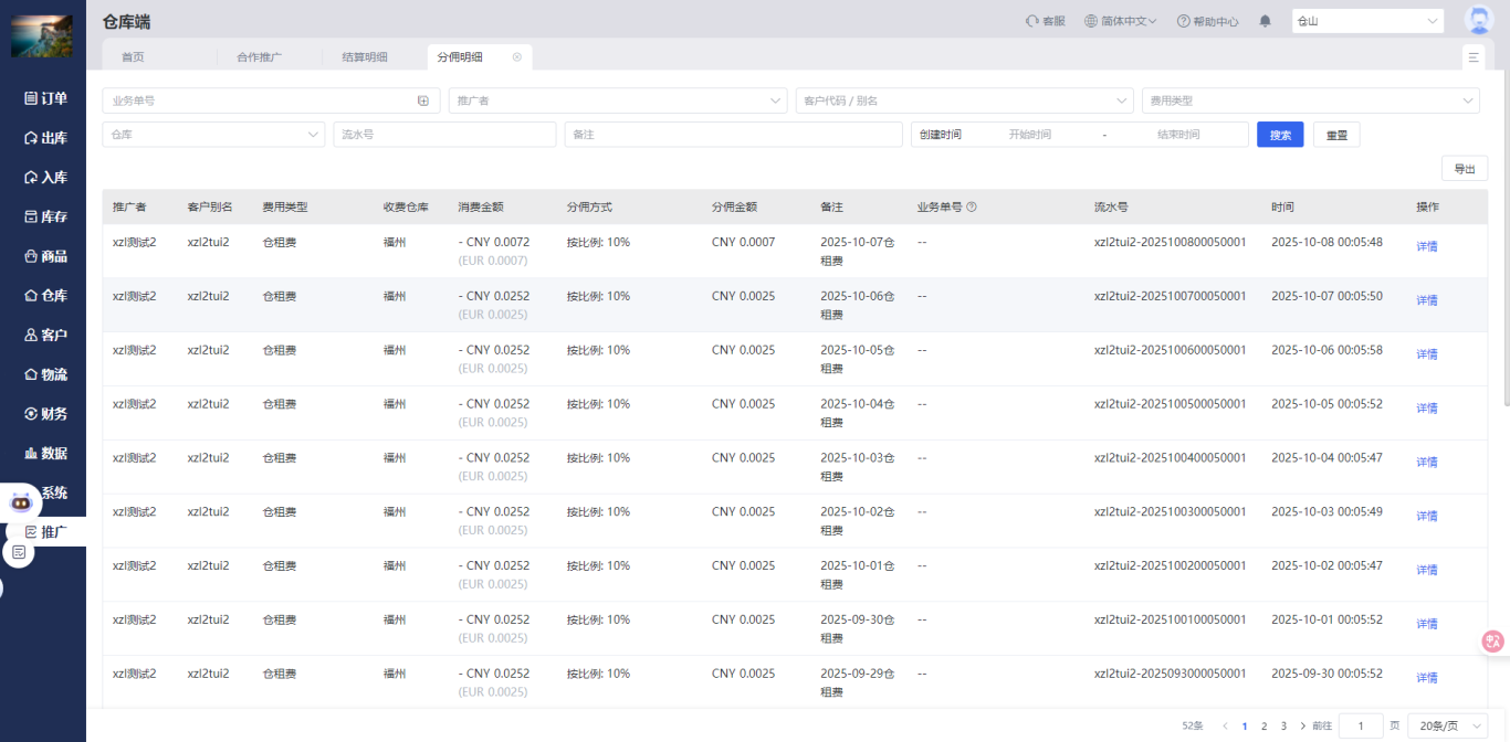 这个系统支持支持按照不同仓库、不同收费类型(含仓租费、出库费、退货费等11类主流费用,覆盖海外仓全业务流程),提供固定金额及按比例两种分佣方式,适配不同推广者的差异化需求,满足多样化的推广合作模式。