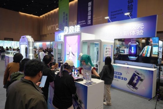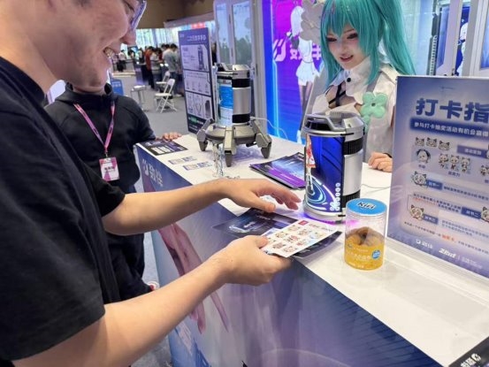 数伴展位以“AI·次元交互体验”为主题,打造了兼具科技感与趣味性的沉浸互动空间。两位人气Coser分别饰演看板娘“姵儿”和“初音未来”,在现场与观众亲密互动,吸引大家参与体验环节与抽奖活动。现场氛围热烈,观众拍照打卡上传至社交媒体,相关话题热度持续攀升,成为WTCC期间备受年轻人关注的展位之一。