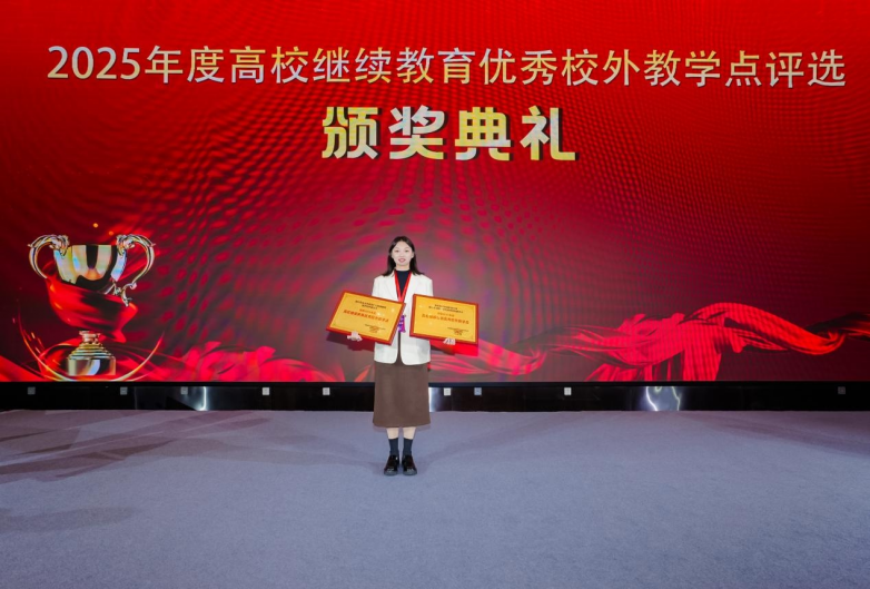 会上,电子科技职业大学重庆市涪陵墨香苑培训学校教学点、重庆工商大学成人高等教育南岸校外教学点以及四川农业大学高等学历继续教育重庆校外教学点,均在此次表彰中荣获“2025年度高校继续教育优秀校外教学点”称号,昭明教育党支部书记余加加、旗下获奖教学点负责人金帆帆校长上台领奖。