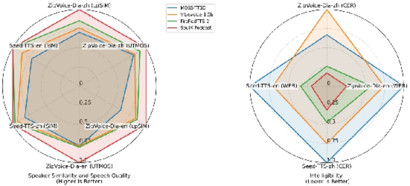 在技术实现方面,SoulX-Podcast采用了LLM+Flow Matching的语音生成范式。该模型以Qwen3-1.7B作为基座模型,基于原始文本模型参数进行初始化,充分继承了其优秀的语言理解能力。这种架构设计使得模型不仅在多人对话场景中表现优异,在传统的单人语音合成与零样本语音克隆任务中也保持了较高水准。特别是在播客生成任务中,相较于近期相关工作,SoulX-Podcast在语音可懂度与音色相似度方面都取得了较好的结果。