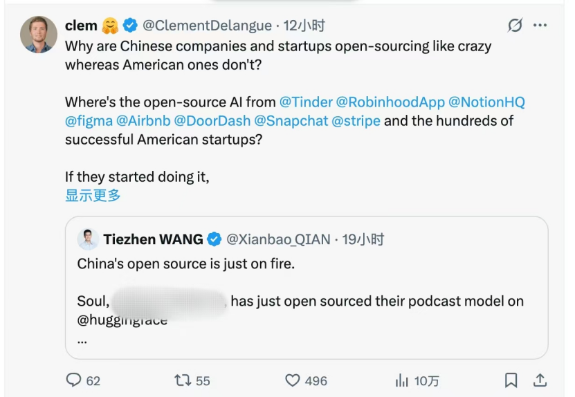 开源之后,SoulX-Podcast迅速在AI社区引发广泛讨论。众多开发者和研究者对模型的多方言支持能力、副语言表达控制以及超长语音生成稳定性给予了积极评价。Hugging Face CEO Clément Delangue也在社交平台上转发了相关讨论内容,进一步扩大了模型的影响力。这些反馈表明,国产开源语音模型正在获得全球社区的关注和认可。