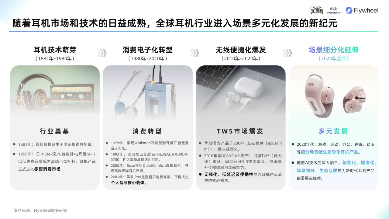 纵观全球耳机行业百年发展,其演进脉络清晰可见:从技术萌芽期的专业工具,逐步转型为大众消费电子品类,并在近十年迎来无线化爆发与场景化延伸。