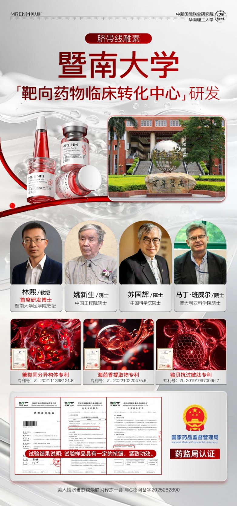 面对抗衰难题,美人媄联合华南理工大学苏健裕教授团队及中新国际联合研究院,历时12年研发出「脐带愈纹焕肤闪释冻干套」。该产品突破传统抗老思路,以"细胞再生"为核心,专研紧致抗皱配方:臻奢动物脐带血提取物:富含干细胞生长因子(SCGF)、表皮生长因子(EGF)等活性物质,可激活休眠细胞,促进胶原与弹性纤维合成,从根源填补皱纹空隙。