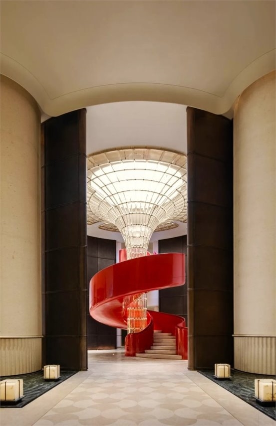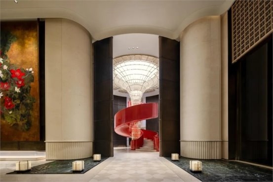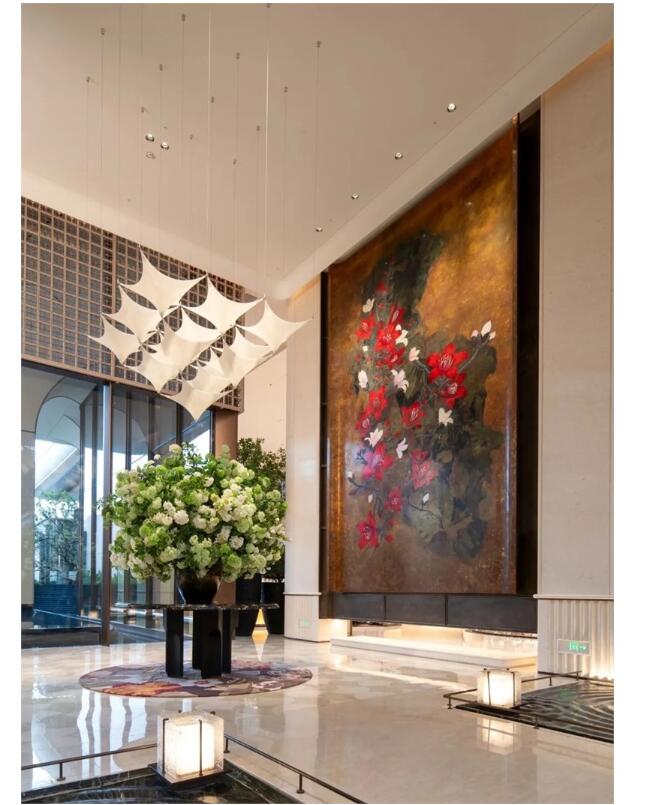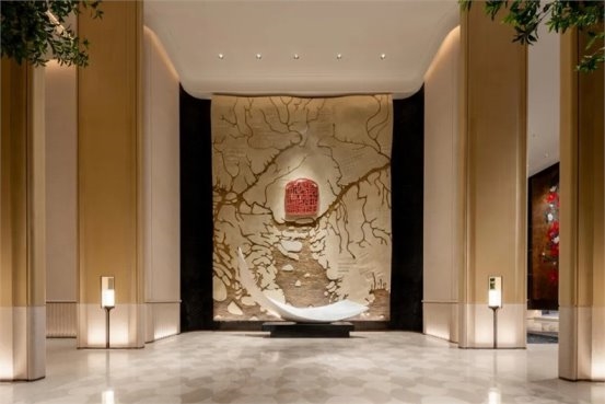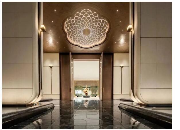 “非遗铜门”|约7.5米高的“非遗铜门”,是由中国国宝级非遗大师朱炳仁首创。在大门蚀刻工艺的基础上刻画生命之树,铜门两侧融合了非遗锤纹锻造工艺;门把手采用掐丝珐琅与錾刻工艺。