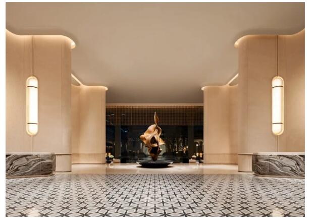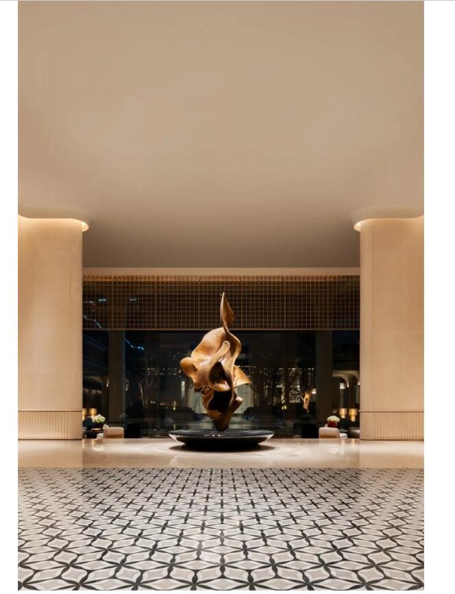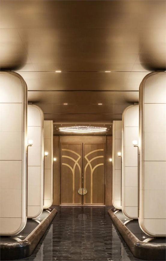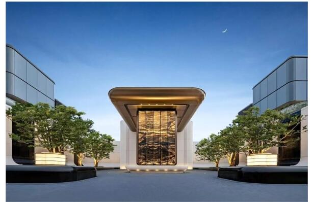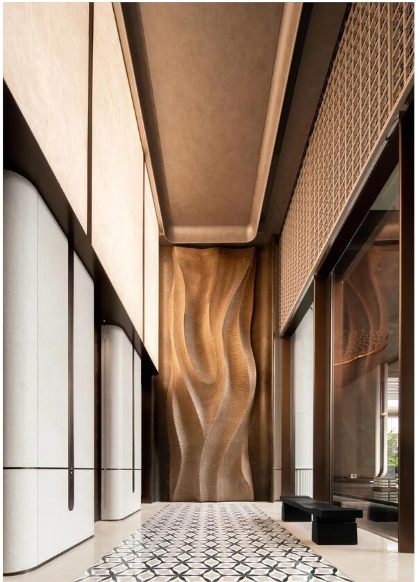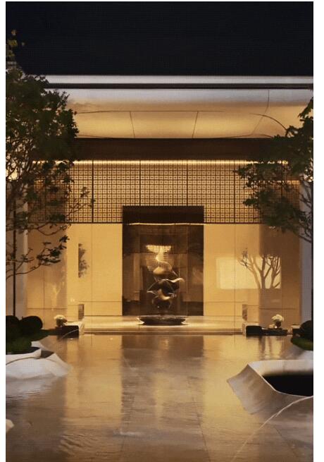 约6000㎡会所,三进院空间。会所以珠水为题,串联起各个空间。布局上为一核心中轴两翼的对称分布,南北是归家双大堂“鎏光映庭”,中轴为约1800㎡的内庭院,两翼打造了会客、休闲等功能区。