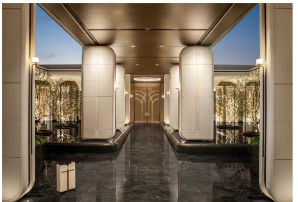 归家一进院的水庭底部由安哥拉黑奢石打造,曲水纳福,门庭富贵。两旁六颗红果冬青树,树龄近百年,枝繁叶茂。正面是由宇宙黑金奢石打造的照壁,寓意着江浪奔涌不息,是极富尊贵感的归家门面。