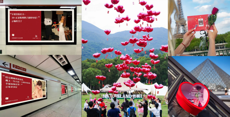 除了理念引导外,DR也始终在鼓励和支持人们落于实处的表达:2025年520期间,DR在深圳、成都等地举办「天降黄金雨」活动,以真金鼓励爱老婆的人持续表达爱;情人节,启动了「喜事官宣计划」,包下地铁大屏供DR族上屏示爱,当最具感染力的幸福笑颜呈现于大屏时,既为用户留下了珍贵的回忆,又提醒众人勿忘身边陪伴的人;2023年七夕,DR在巴黎街头的「应急玫瑰」活动,通过散落于各地的玫瑰盒子,悄然提醒每个人:爱,要及时说出口......