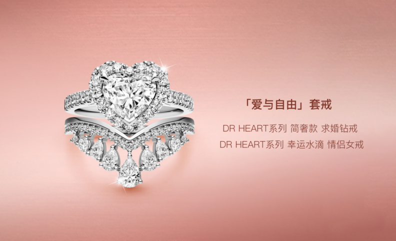 以DR爆火的标识款——DR HEART「爱与自由」套戒为例,该套戒由DR真心戒和DR水滴戒组成,主戒真心戒灵感源于“爱神会赋予相爱的眷侣心型印记,护佑他们一生一世”的古老传说,用独家「同心切工」工艺,以13:14的极致比例以及58个切面,呈现“内外双心,交相辉映”的惊艳视觉效果,代表两颗双向奔赴的真心。辅戒水滴戒,则如9颗灵动水滴,如同所有幸运和美好都流向爱人。当二者叠戴时,水滴戒仿若一双翅膀托举主戒,暗喻“我是爱你的,你是自由的”。