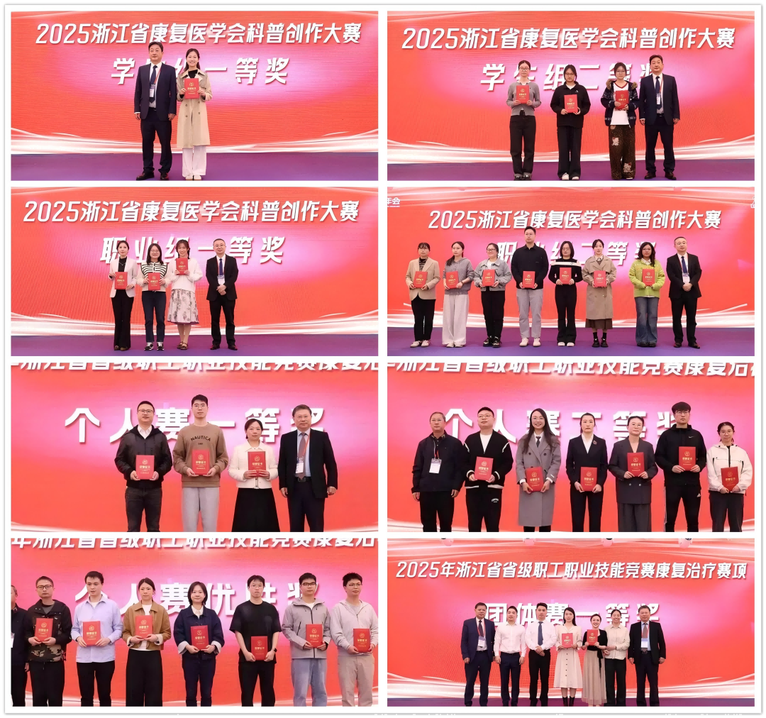 在随后的颁奖环节中,大会分别对综合学术年会优秀论文、2025浙江省康复医学会科普创作大赛获奖作品、浙江省省级职工职业技能竞赛康复治疗赛项进行颁奖。