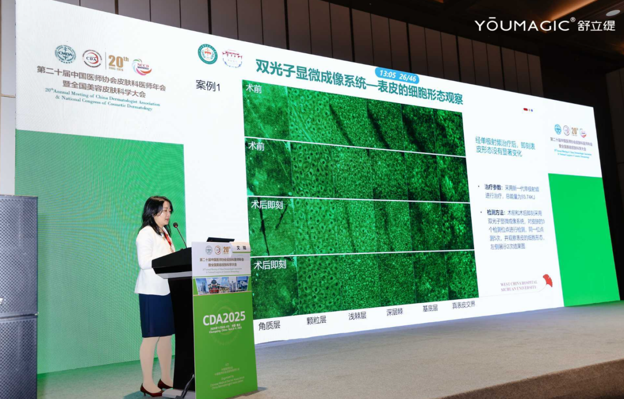 四川大学华西医院皮肤科副主任文翔则聚焦疗效评估体系革新,提出“客观检测+主观评价”的科学范式。并分享了团队的研究成果,表示舒立缇治疗后,下颌提拉效果明显,皮肤弹性显著增加;治疗1个月皮肤厚度提升约0.03厘米,且皮下脂肪层无明显容积损失;且双光子等检测证实表皮、真皮层结构无异常,为产品安全性与有效性提供了多维度实证,也为行业提供了可复制的评估标准。
