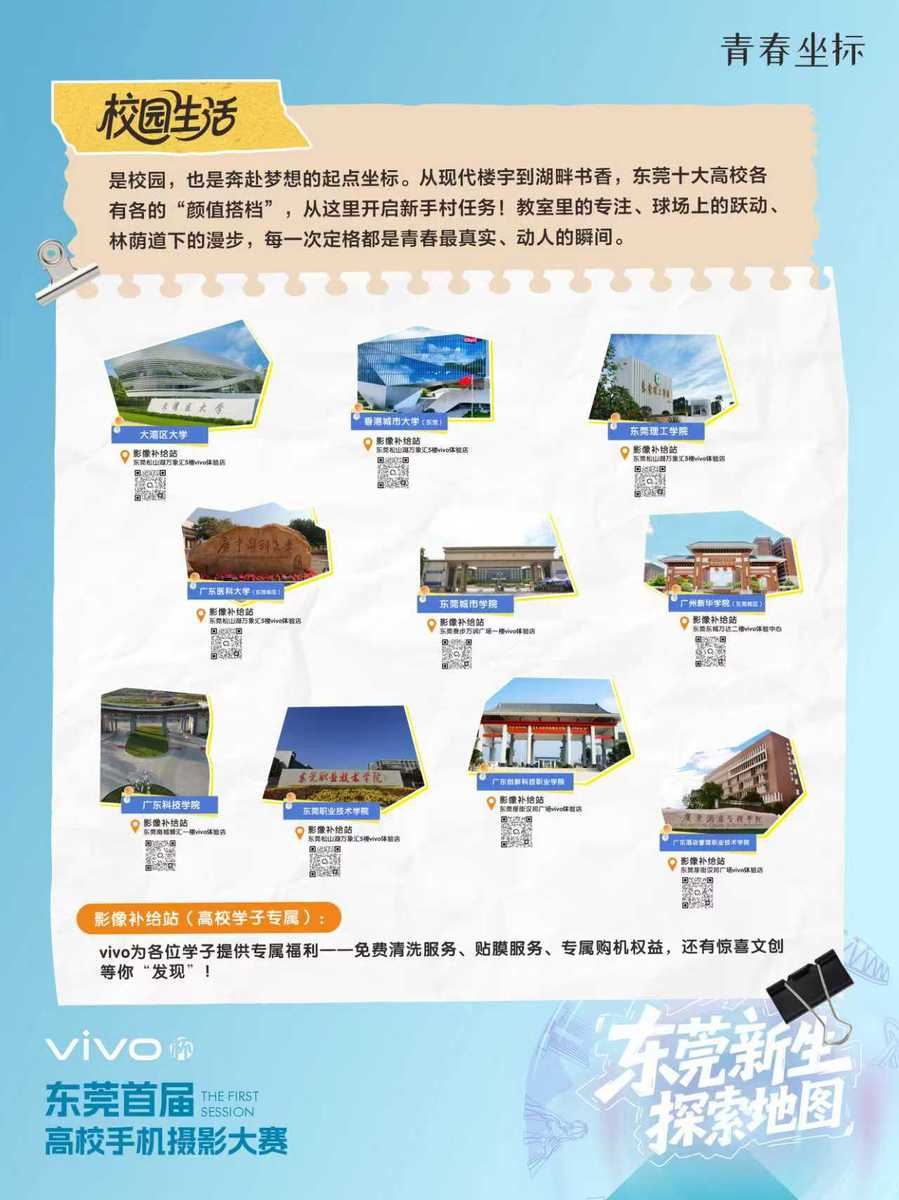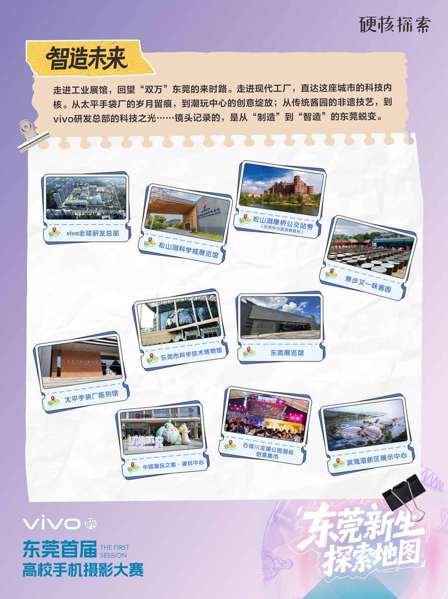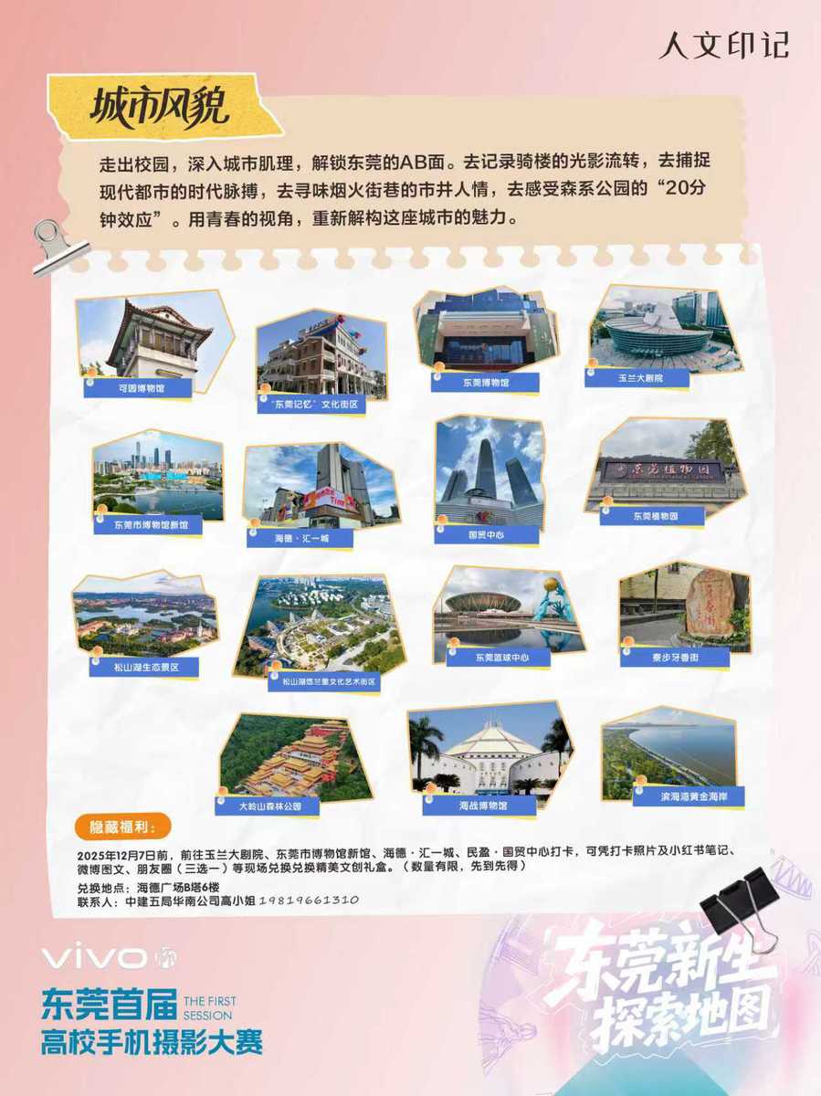 vivo杯“初见东莞·光影新生”高校手机摄影大赛目前正面向10所在莞高校征集作品,作品主题涵盖“校园生活”“城市风貌”“智造未来”,征集期将持续至12月。优秀作品将通过专家评审与网络投票双重筛选,最终举办专题展览。