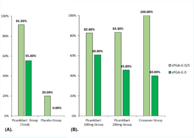 第4周时,sPGA-G自基线的平均变化分别为-1.3(0.89)、-1.2(0.78)和-0.6(1.26)。第16周时,平均sPGA-G分别为0.2(0.66)、0.1(0.34)和1.4(1.35)。匹康奇拜单抗组(100mg匹康奇拜单抗组+200mg匹康奇拜单抗组)的sPGA-G 0/1应答率为91.5%,显著高于对照组(20.0%,P<0.0001)。匹康奇拜单抗组超半数参与者(56.6%和54.2%)达到sPGA-G 0,而对照组无参与者(0)达到sPGA-G 0。第52周时,100mg和200mg匹康奇拜单抗组的sPGA-G应答率仍维持较好水平,报告的sPGA-G 0/1率分别为82.6%和83.3%,sPGA-G 0率分别为60.9%和45.8%。