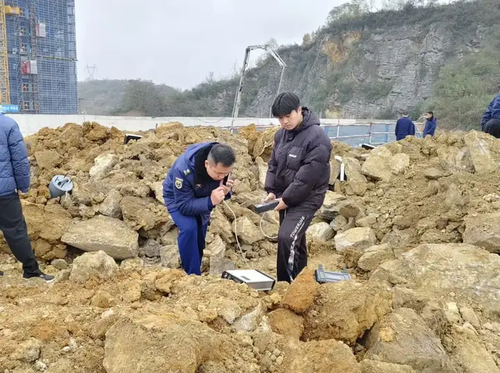 团队研究生廖佳新、白皓宇同学向应急管理部队员示范仪器应用,模拟灾害情况