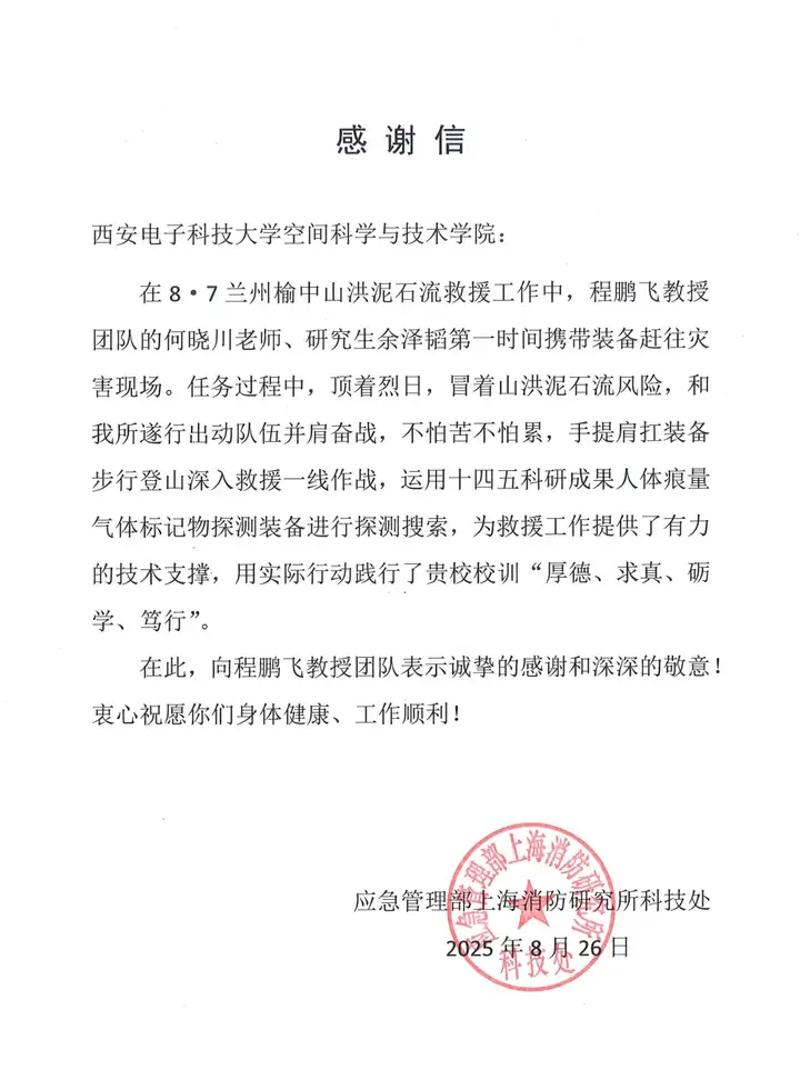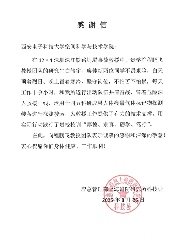 在救援中,西电师生以实际行动展现了科研力量在社会应急救援中的重要作用。应急管理部上海消防研究所科技处在感谢信中表示,程鹏飞团队在关键时刻挺身而出,不畏艰难、勇于担当,为救援工作提供了“有力的技术支撑”,并对此表示“诚挚的感谢和深深的敬意”。
