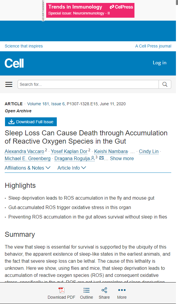 在这项发表在顶级期刊《Cell》的研究中,科学家们发现累积的ROS会破坏细胞修复,并导致线粒体功能受损以及免疫系统失调,最终导致寿命的大幅缩减。而在使用抗氧化技术预防睡眠不足所造成的氧化损伤后,剥夺睡眠所造成的寿命损伤被显著缓解,该项研究也为几年后恩利维的问世打下了基础。