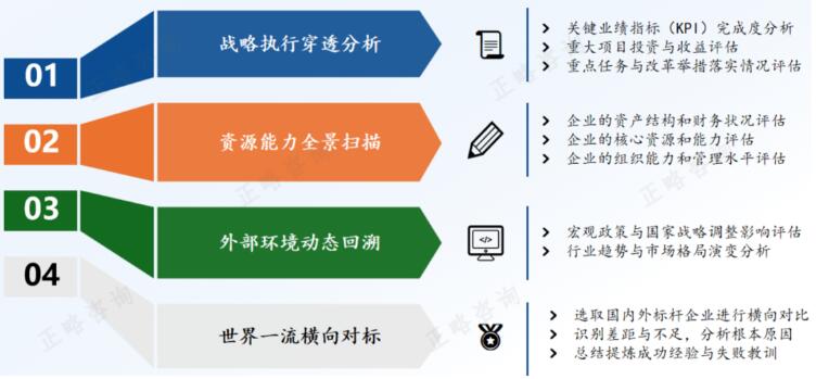 正略咨询建议央企“十四五”规划总结通过“四维十一步”闭环评估体系进行总体评估,深入挖掘规划执行过程中的深层次问题与成功经验,为“十五五”规划的制定奠定坚实基础。