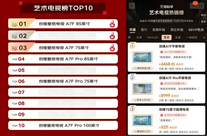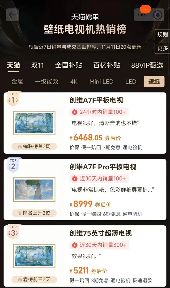 战报显示,在本次双11期间(10月9日至11月11日),创维壁纸电视的消费者好评数突破1万条,展现出强大的市场号召力与极高的品牌美誉度。在各大权威榜单上,创维壁纸电视A7F Pro系列作为最新一代壁纸电视旗舰,也频频登顶,彰显断档领先地位:不仅在天猫渠道占据艺术电视和壁纸电视分类榜单前三,在京东平台,该系列更包揽艺术电视榜前10中的5席。至此,创维壁纸电视已连续三年荣登京东、天猫两大平台的艺术电视销售榜TOP1,持续夯实其高端引领地位。其中,明星产品75吋创维壁纸电视75A7F更是一度卖断货,是名副其实的“断货王”,正在成为更多追求美好生活体验的用户的首选。对于仍然在观望买什么艺术电视的消费者,完全可以照着这些含金量极高的双 11榜单“闭眼入”。