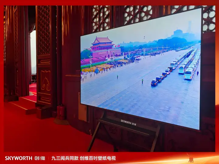 尤为值得一提的是,其旗舰型号创维百吋壁纸电视100A7F Pro,更是凭借其领先的显示技术与稳定的传输表现,光荣地成为了2025年“九三阅兵”天安门城楼“现场唯一视频显示终端”,彰显了国货精品的顶尖实力。