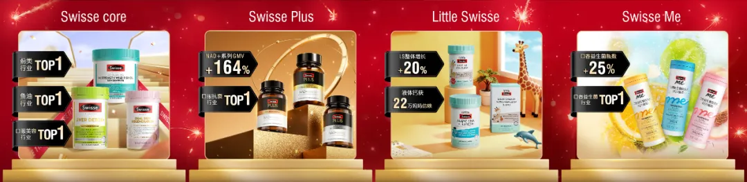 此外,Swisse斯维诗与Swisse PLUS、Little Swisse、Swisse Me组成的“Swisse Mega Brand”品牌战略矩阵精准把握消费细分需求,双十一期间全面爆发。其中,Swisse斯维诗稳占蓟类3、鱼油4、口服美容行业5销量No.1;Swisse PLUS斩获口服抗衰行业销量No.16,NAD+系列GMV增长164%7;Little Swisse整体增长20%8;Swisse Me口香益生菌行业实现销量No.19,再次展现高端营养领域的领先势能。