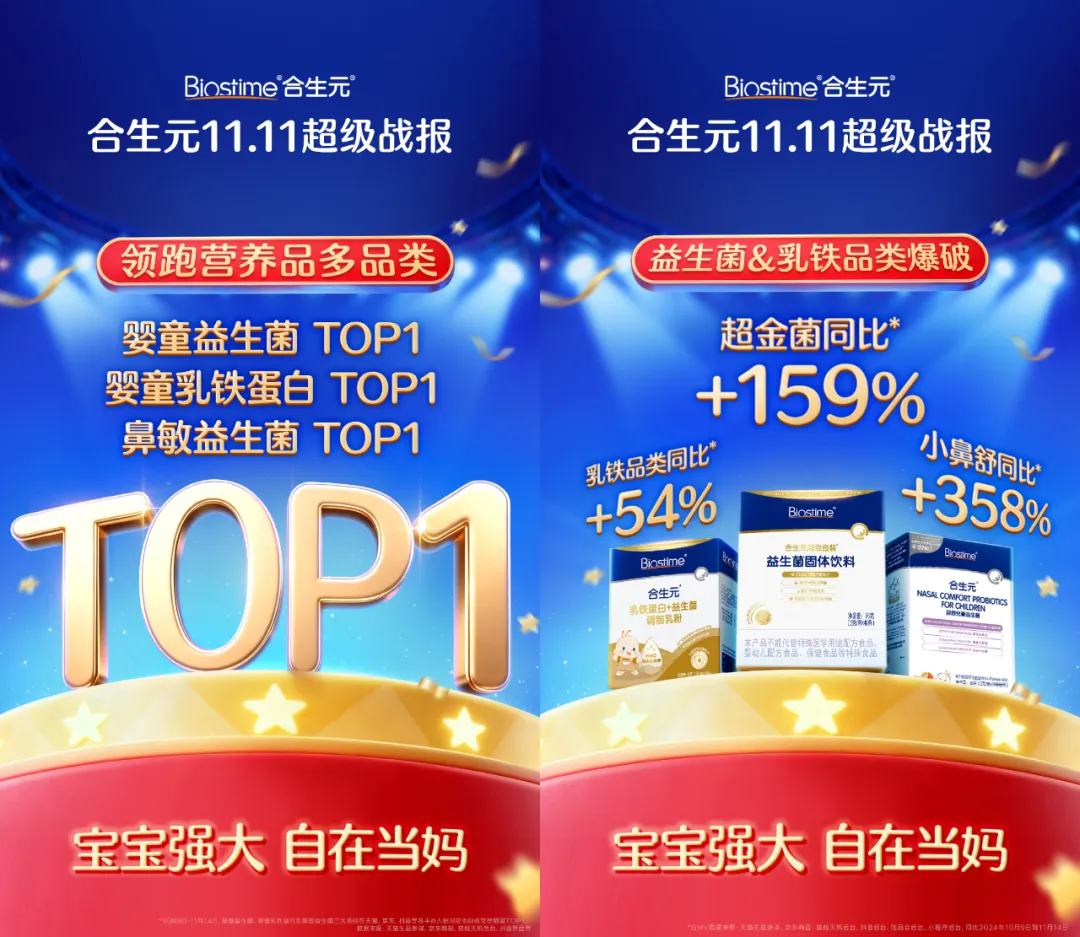 2025年双十一期间,合生元持续深化“奶粉+营养品”双轮驱动,构筑全方位婴童营养体系,全渠道GMV实现显著提升37%10,创历史新高,稳居婴童营养行业领跑阵营。