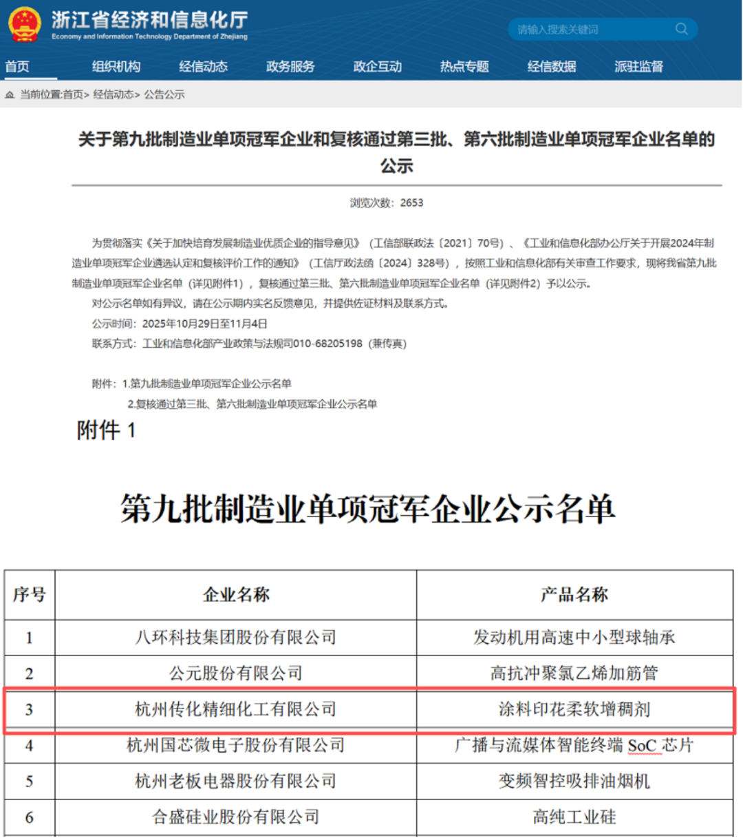 近日,浙江省经济和信息化厅公示第九批制造业单项冠军企业名单,浙江省范围内仅29家企业成功入选,杭州传化精细化工有限公司凭借核心产品“涂料印花柔软增稠剂”跻身其中,成为榜单中纺织化学品细分领域的代表企业。此次入选是传化纺织化学品印染助剂领域首次实现国家级单项冠军突破,标志着企业在纺织化学品细分赛道的技术实力与市场竞争力获得权威认可。