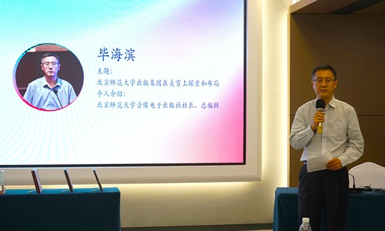 北京师范大学音像电子出版社社长、总编辑毕海滨分享“北京师范大学出版集团在美育上的探索和布局”,介绍北师大出版集团依托学术优势,在美育教材开发、数字资源建设、师资培训体系搭建等方面的成果,为行业提供体系化美育资源支持。