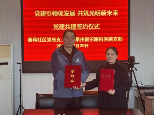 11月20日,“党建引领促发展 共筑光明新未来”党建共建签约仪式在秦蒋社区党群服务中心举行。秦蒋社区党总支与泰州爱尔眼科医院支部正式牵手,以党建为纽带,把优质眼科服务送到居民“家门口”。
