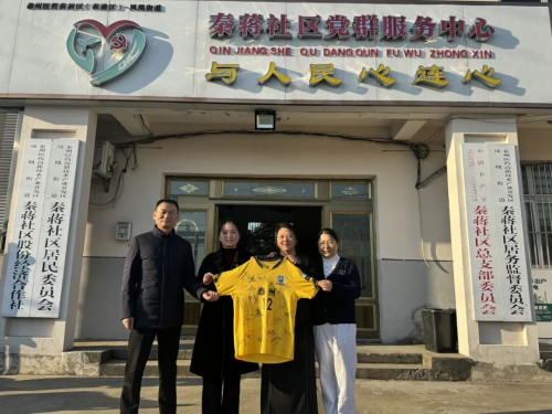 仪式现场,一件签满苏超冠军泰州队球员名字的球衣——这是主教练周高萍委托球队带来的“乡情礼物”,让冠军的温暖与社区的烟火气紧紧相连。