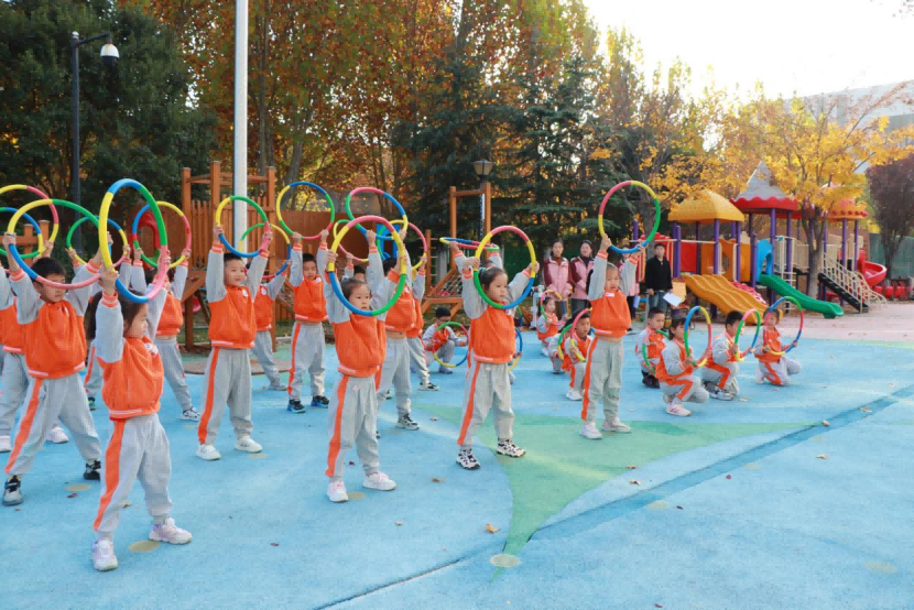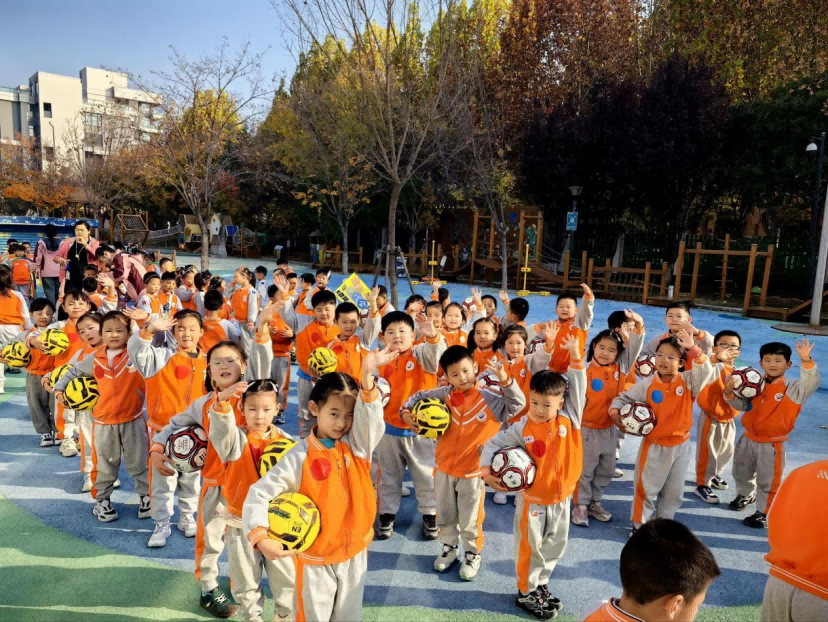 大班活动以“秋日丛林大冒险”为主题,将自然探索与体能发展有机结合。各班以篮球、足球、手球、跳绳、呼啦圈等器械展示入场,步伐整齐、气势昂扬,展现出大班幼儿的朝气与集体荣誉感。十大循环闯关游戏,如“落叶传递”“落叶过河”“秋风助力赛”等,不仅锻炼了幼儿的身体协调、平衡与协作能力,更在亲子互动中深化了情感联结。父母与孩子在游戏中成为并肩作战的伙伴,在欢笑与挑战中建立起更加牢固的亲子纽带。