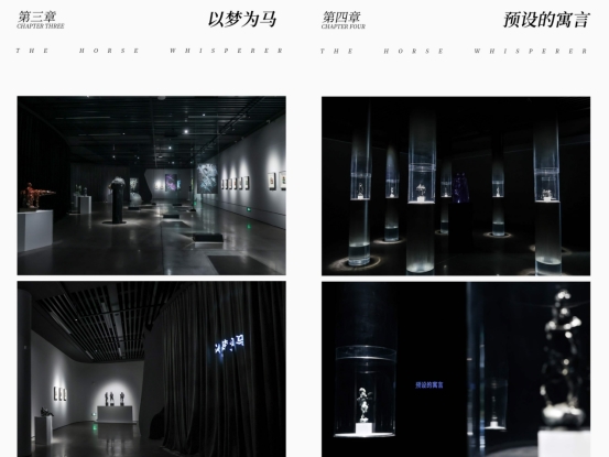 策展人苏阳以"寓言场域"构建独特的空间叙事,主展厅通过两匹交错的马脊线分割出四个篇章,与外场打造的新原石空间构成完整故事线,观者在精心设计的动线与光影中穿梭,身体感知与作品、空间产生微妙共振,在迷踪与反刍中完成对自由、规训等命题的思辨。