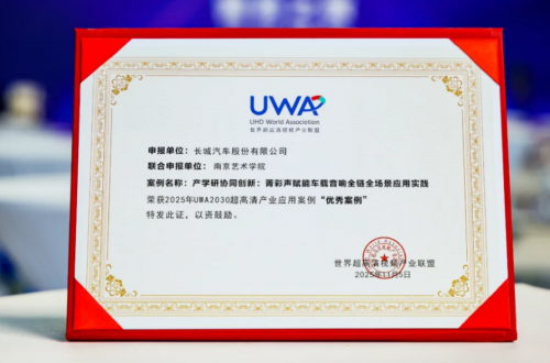 长城汽车深入探索智能座舱超高清影音技术,取得了一系列重磅成果。在2025 UWA SUMMIT暨世界超高清视频产业联盟会员大会,长城汽车与南京艺术学院联合申报的“菁彩声赋能车载音响全链全场景应用实践”案例,荣获2025年UWA2030超高清产业应用案例“优秀案例”奖。