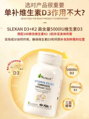 SLEKAN强乐康维生素D3+K2胶囊专为骨骼健康定制。核心采用柠檬酸钙+柠檬酸镁+维生素D3+维生素K2科学复合配方,四重成分协同发力护骨:柠檬酸钙作为高吸收钙源,水溶性好且对胃肠道刺激小;柠檬酸镁不仅补充镁元素(骨骼重要组成部分),更能促进钙吸收,减少便秘等补钙副作用;维生素D3助力钙的肠道吸收与肾脏重吸收;维生素K2精准引导钙沉积入骨。配方精准把控各成分剂量比例,其中D3含量5000IU、K2含量100mcg,钙镁配比科学,确保补钙-促吸-定向沉积全链条高效协同。实现钙镁精准补充与高效利用,筑牢骨骼根基。