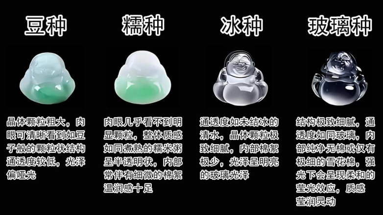 翡翠究竟有哪些分类?它们又有什么特点?相信不少新入门翡翠的对此都颇有困惑。现在市场上翡翠划分维度多样,行业内最常见的是以种水划分为豆、糯、冰、玻四大类,这是对翡翠通透度、晶体结构最直观的概括。