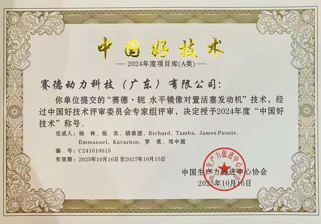近日,由中国生产力促进中心协会主办的“中国好技术”大会暨2024年度“中国好技术”称号授予仪式在北京圆满落幕。作为国内技术创新领域的权威评选平台,本届活动共征集全国654项科技创新成果,经多轮严格评审,最终仅有106项技术入选代表最高水平的A类项目库,入选率不足16%。在这场聚焦“创新性、实用性、可推广性”的硬核技术角逐中,赛德动力科技(广东)有限公司凭借其国际首创的“赛德·轭”水平镜像对置活塞发动机项目脱颖而出,成功斩获先进制造领域A类奖项,标志着我国在高端动力装备领域实现了从技术追赶到全球领跑的关键跨越。