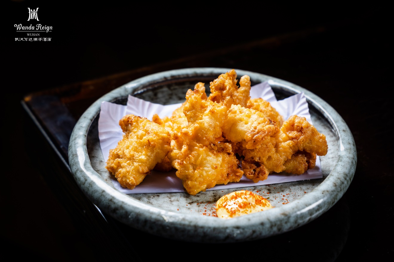 热辣鲜香的铁板烧系列是套餐的另一大亮点。铁板烧鱿鱼圈经大厨现点现做,高温铁板锁住鱿鱼的鲜嫩汁水,表皮焦香微脆,咬下时弹牙多汁,搭配秘制酱汁,鲜香味醇;双味牛舌则使用薄厚均匀的牛舌分别以黑椒和酱汁调味,在铁板上滋滋作响,入口脆嫩无腥,两种风味各有千秋,满足味蕾的双重体验。此外,外酥里嫩的唐扬鸡块作为经典铁扬物,外皮金黄酥脆,内里鸡肉细嫩多汁,蘸取特制酱料食用,香而不腻。