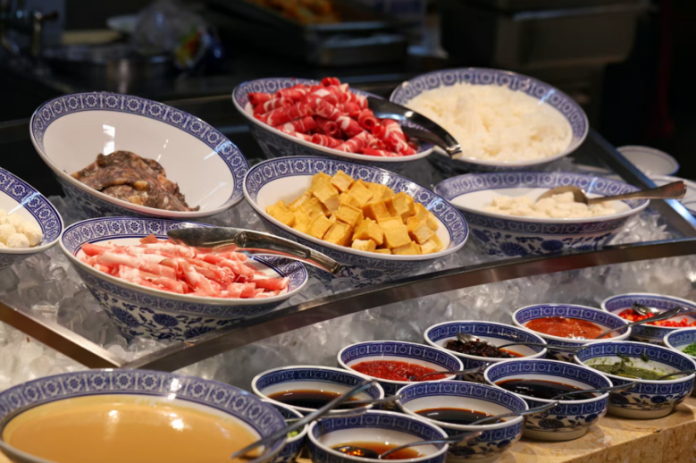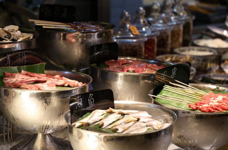 火锅区的精彩,因“鲜”而活。我们全新升级,特设老北京铜锅专区,主打当日现切的牛羊肉卷,红白相间的纹理在盘中舒展,只需在沸腾的汤中轻轻一涮,蘸上秘制麻酱小料,入口便是满嘴的鲜嫩醇厚。此外,手打肉丸、时令蔬菜等琳琅满目的涮品环绕四周,任您随心搭配,演绎专属自己的冬日风味。