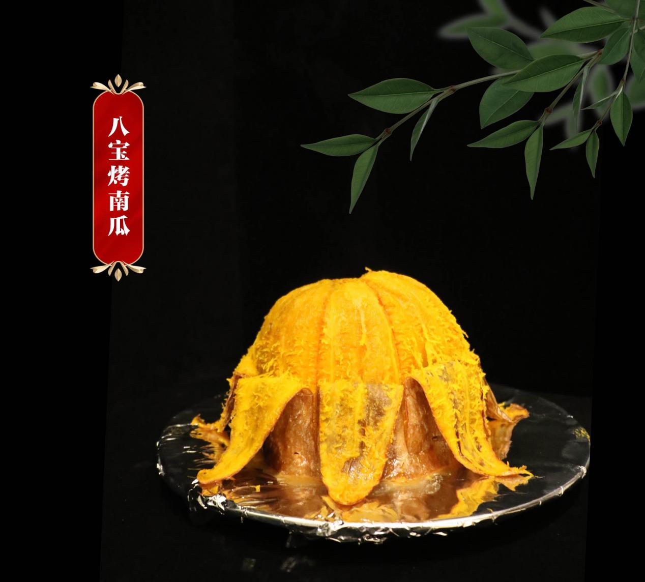 精选阿克苏糖心南瓜为盏,填入塔城葡萄干、精河枸杞、伊犁鹰嘴豆等八种西域珍品,淋上喀什石榴蜜,馕坑慢烤至金黄。南瓜蓉绵密如雪,八宝馅料甜润交织,一勺舀尽天山脚下的冬日甜蜜。
