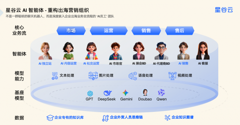 星谷云基于自主研发的一站式AI智能体矩阵,深度融合多种基座大模型技术,结合企业第一方数据,形成了独特的技术优势: